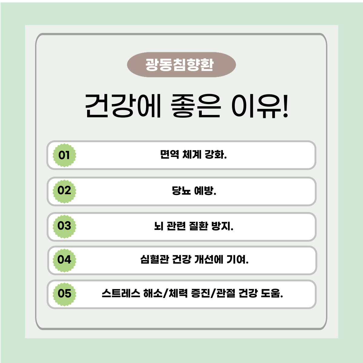 이러한 주요 성분들의 시너지 효과로 인해 광동 침향환 프리미엄은 현대인들의 다양한 건강 문제를 여러 방면에서 챙겨주는 종합 비타민 같은 역할을 한다고 볼 수 있습니다.