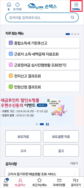 모바일 앱 외에도 국세청 홈택스 홈페이지에서도 확인이 가능합니다.