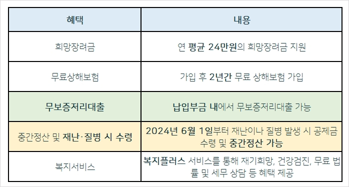 이외에도 각 지자체마다 월 1~3만원의 희망장려금을 지원받을 수 있으며, 무료 상해보험 가입, 납부내 대출, 복지 서비스 제공, 중간 정산 및 재난, 질병 발생 시 공제금 수령 가능해집니다.