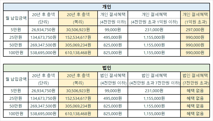 위의 표에는 매월 납입 금액에 따라 20년 후 예상되는 총 적립금을 단리와 복리 방식으로 계산하였습니다. 개인 사업자와 법인 대표자의 소득 구간에 따른 연간 세금 절감 혜택이 각각 다른데요.