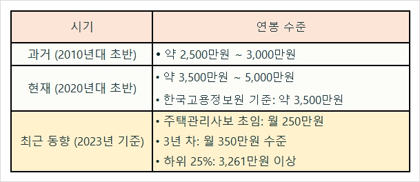 최신 연봉 동향을 살펴보면, 공동주택 증가와 관리 전문화로 인한 수요 증가로 전반적인 연봉이 상승하는 추세를 보이고 있으며, 지자체 공무원 채용 증가로 공공 부문 기회가 확대되고 있습니다.