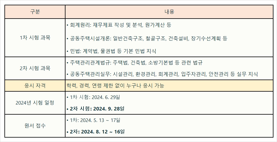 2024년 주택관리사 시험과목은 1차와 2차로 나뉘고 1차는 크게 회계원리, 공동주택시설개론, 민법으로 구성됩니다. 2차는 주택관리관계법규, 공동주택관리 실무이며 세부 과목 내용은 위에 표를 참고해 주세요.