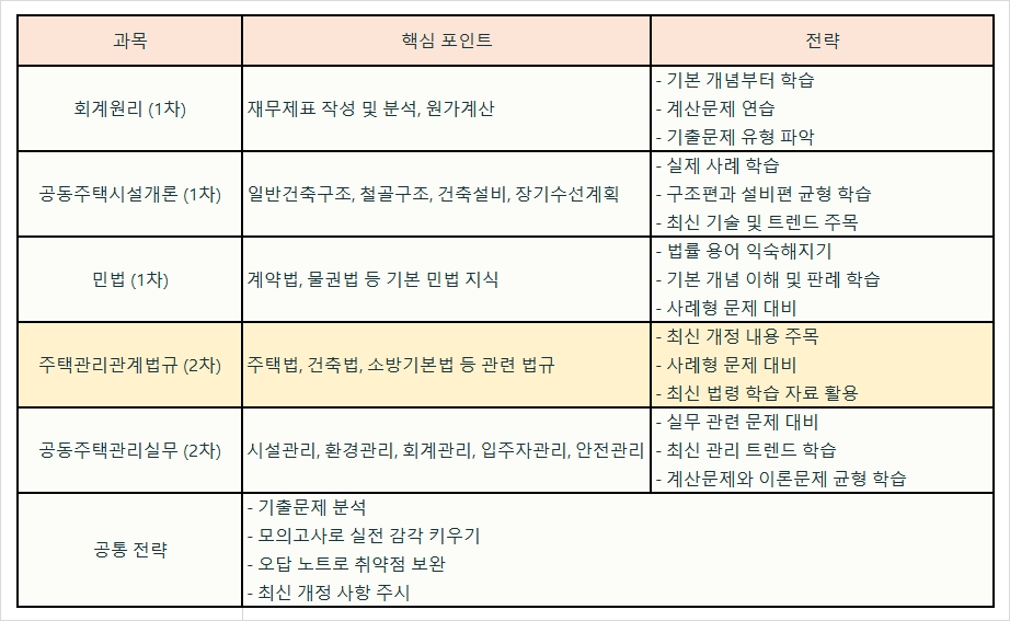 각 과목별로 제시된 학습 전략을 토대로 꾸준히 공부한다면 합격의 문턱을 넘는 데 큰 도움이 될 것입니다. 주택관리사가 되어 주거 환경 개선에 기여하고자 하는 모든 분들의 성공을 기원합니다. 파이팅!