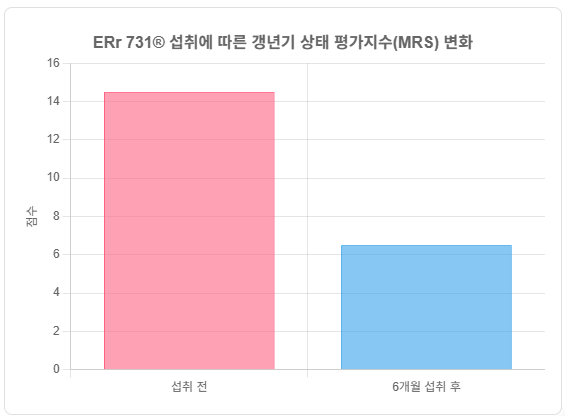 연구 결과, ERr 731®을 6개월간 섭취한 그룹은 갱년기 상태 평가지수(MRS, Menopause Rating Scale) 총점이 평균 14.5점에서 6.5점으로 유의미하게 감소했습니다. 특히 안면홍조, 과민성, 수면 문제, 신체적/정신적 피로감 등 다양한 갱년기 증상이 개선된 것으로 나타났습니다.